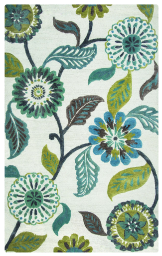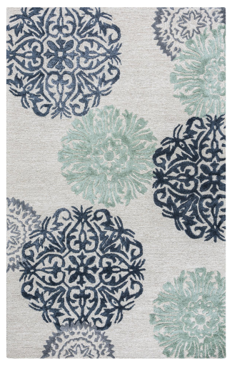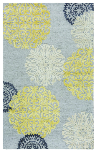 The Rizzy Home Eden Harbor Rug features a soft grey background with a low loop pile that is adorned with captivating hand-trimmed floral medallions in yellow, ivory, and dark grey. The embossed design creates the illusion of snow falling to the ground. This piece is meticulously crafted from a blend of 80-percent wool for warmth and 20-percent viscose for added luster, and is hand-tufted to ensure quality. The edges are finished with matching wool for a polished look.