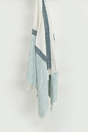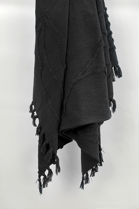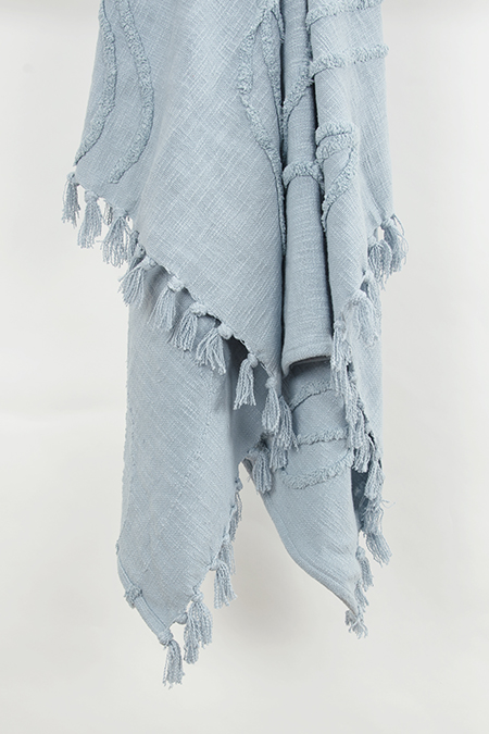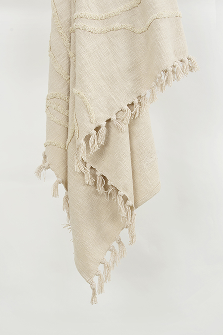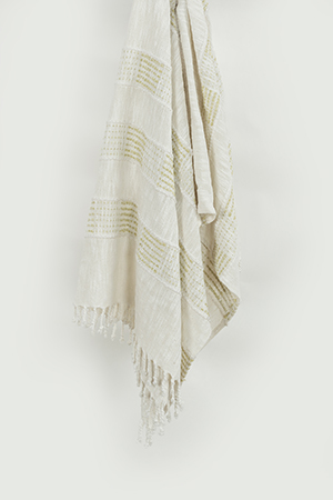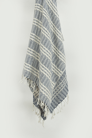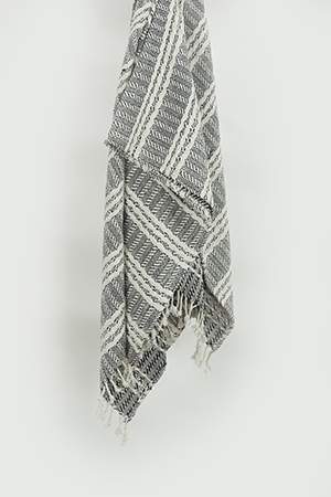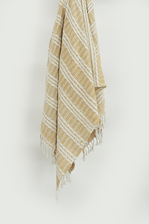 this hand loomed throw is beautifully executed in a chunky cotton yarn. Colors are woven into the construction giving a subtle stripe approach. Warp yarns are twisted and hand tied into rolled fringe at each end. This throw is medium weight and is a beautiful chill-chaser. It adds an artisinially crafted kiss to any decor.